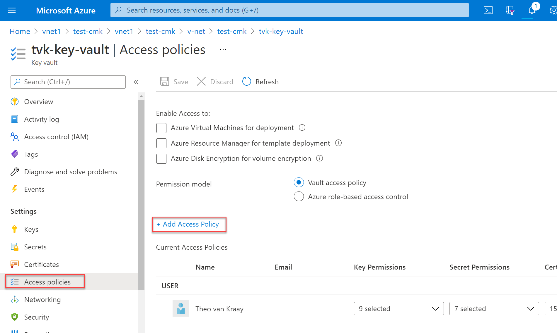 principalIdvalore per usarlo in un secondo momento."identity": { "principalId": "aaaaaaaa-bbbb-cccc-1111-222222222222", "tenantId": "aaaabbbb-0000-cccc-1111-dddd2222eeee", "type": "SystemAssigned" }Nella portale di Azure passare all'insieme di credenziali delle chiavi e selezionare Criteri di accesso. Selezionare quindi Aggiungi criteri di accesso per creare un criterio di accesso per le chiavi.