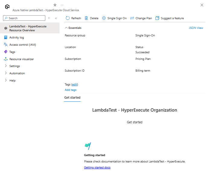 Screenshot di una risorsa LambdaTest - HyperExecute nel portale di Azure con la panoramica visualizzata nel riquadro di lavoro.