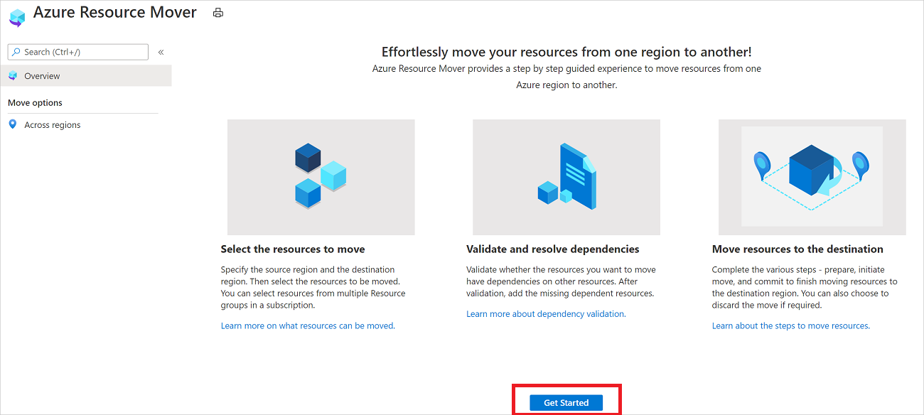 Nel riquadro Panoramica di Spostamento risorse di Azure selezionare Sposta tra aree.