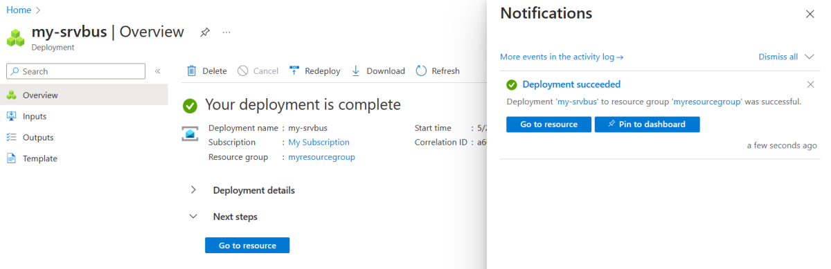 Sulla barra degli strumenti selezionare l'icona Notifiche a forma di campana per monitorare il processo di distribuzione. Al termine della distribuzione, è possibile selezionare Aggiungi al dashboard, che crea un riquadro per questo servizio nel dashboard del portale di Azure come collegamento alla pagina Panoramica del servizio. Se si seleziona Vai alla risorsa, viene visualizzata la pagina Panoramica del servizio.