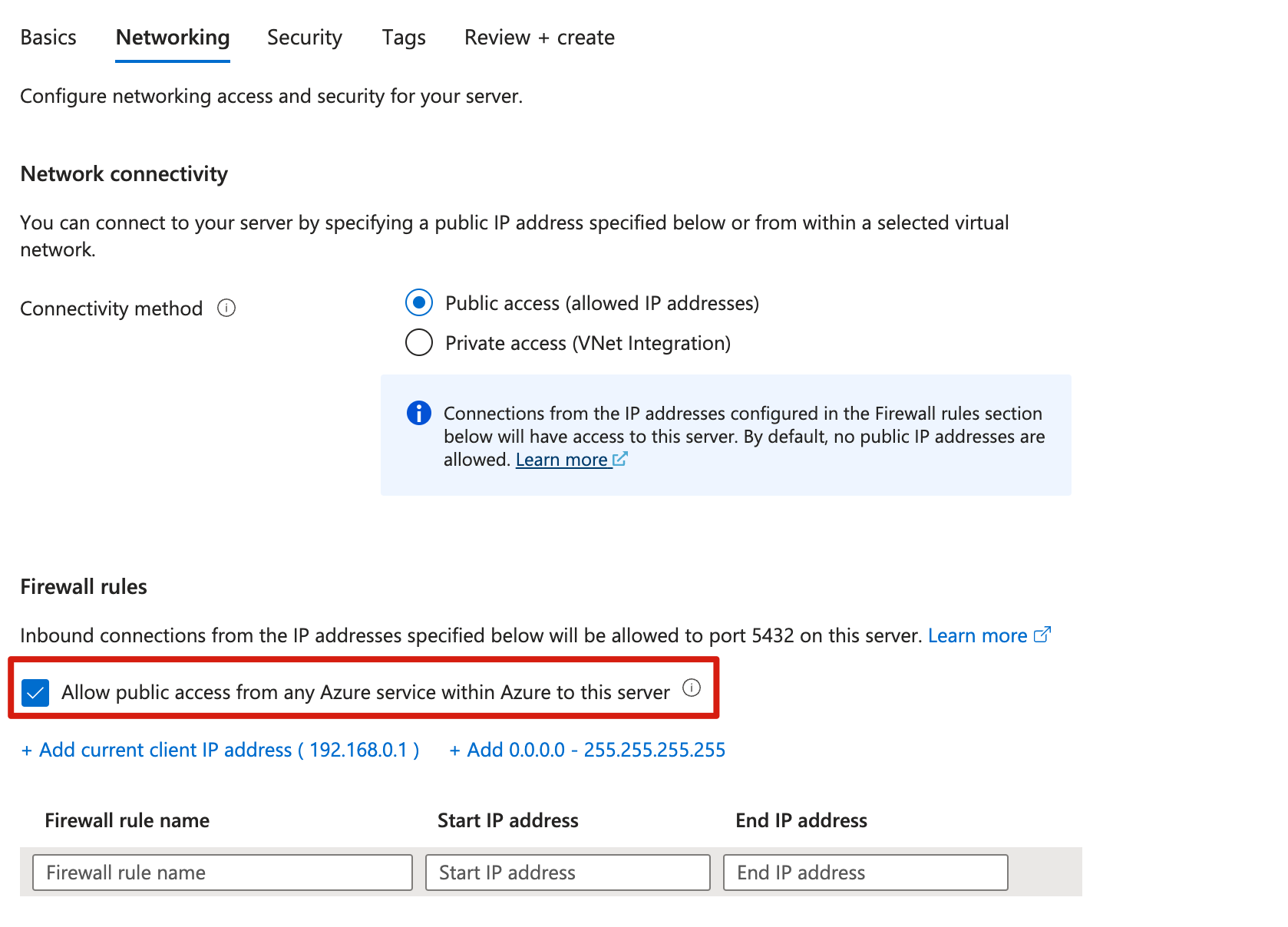 Consenti l'accesso pubblico a questo server da qualsiasi servizio di Azure in Azure: opzione selezionata
