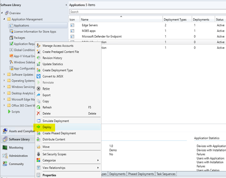Chiudere la procedura guidata, fare clic con il pulsante destro del mouse sull'applicazione creata di recente e distribuirla nella raccolta di server di livello inferiore. In locale, l'installazione può essere confermata in Software Center. Per informazioni dettagliate, controllare i log di Cm all'indirizzo