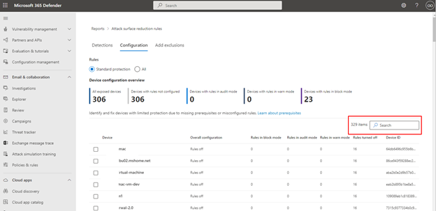 Nella scheda Configurazioni è possibile visualizzare quali regole di riduzione della superficie di attacco sono abilitate e la relativa modalità per ogni dispositivo selezionando il dispositivo che si vuole esaminare.