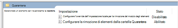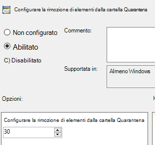 Nella cartella Quarantena configurare la rimozione degli elementi dalla cartella Quarantena.