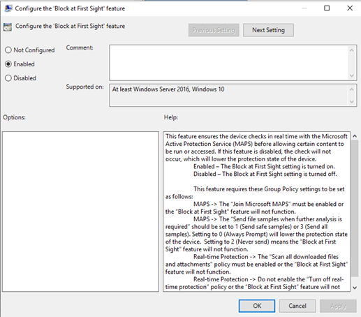 Quando si configurano i criteri a livello di protezione cloud su Criteri di blocco predefinito Microsoft Defender Antivirus, il criterio verrà disabilitato. Questo è ciò che è necessario per impostare il livello di protezione sul valore predefinito di Windows.