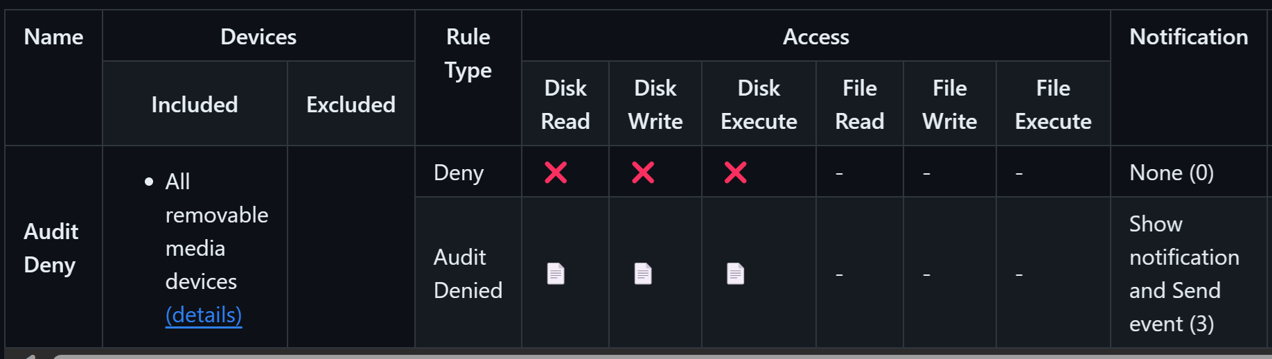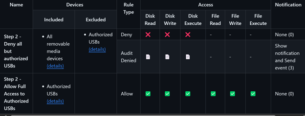 Per personalizzare il comportamento, il controllo dispositivo usa criteri che sono una combinazione di gruppi e regole. Iniziare distribuendo un criterio che nega tutto l'accesso a tutti i dispositivi di archiviazione rimovibili e controlla l'evento inviando una notifica al portale e all'utente. L'immagine seguente riepiloga queste impostazioni: