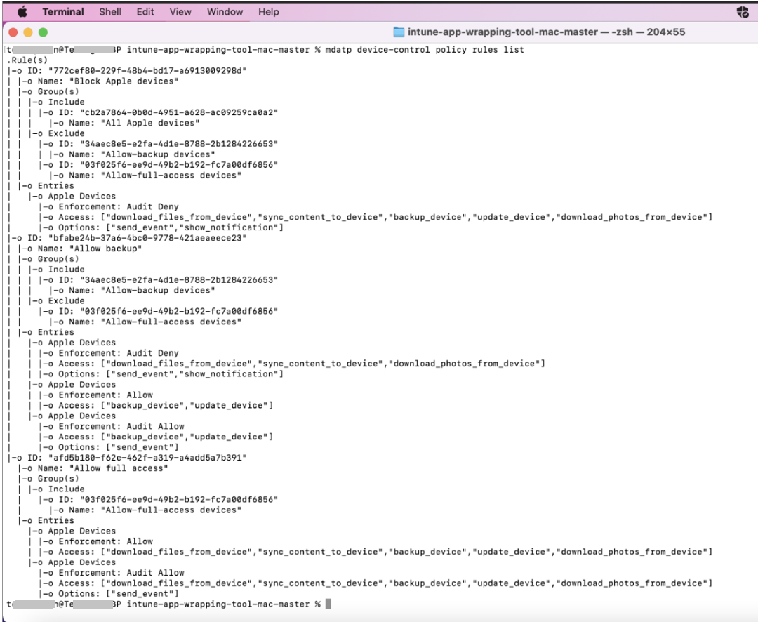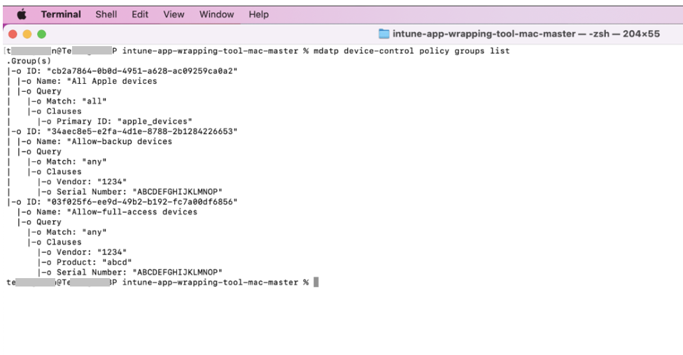 Risposta 2: Eseguire l'elenco dei gruppi di criteri di controllo dei dispositivi mdatp per visualizzare tutti i gruppi iOS nel computer: