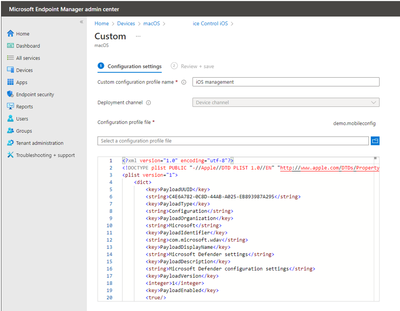 A questo momento, sono disponibili groups, rulese settings, sostituire il file mobileconfig con tali valori e inserirlo nel nodo Controllo dispositivo. Ecco il file demo: mdatp-devicecontrol/demo.mobileconfig in main - microsoft/mdatp-devicecontrol (github.com).Here's the demo file: mdatp-devicecontrol/demo.mobileconfig at main - microsoft/mdatp-devicecontrol (github.com). Assicurarsi di convalidare i criteri con lo schema JSON e assicurarsi che il formato dei criteri sia corretto: mdatp-devicecontrol/device_control_policy_schema.json at main - microsoft/mdatp-devicecontrol (github.com).