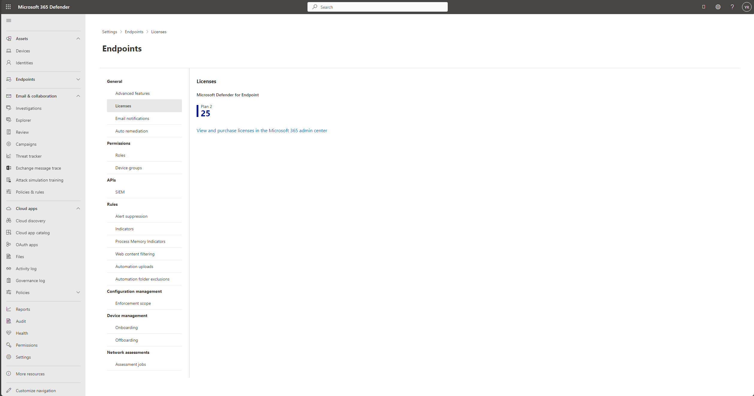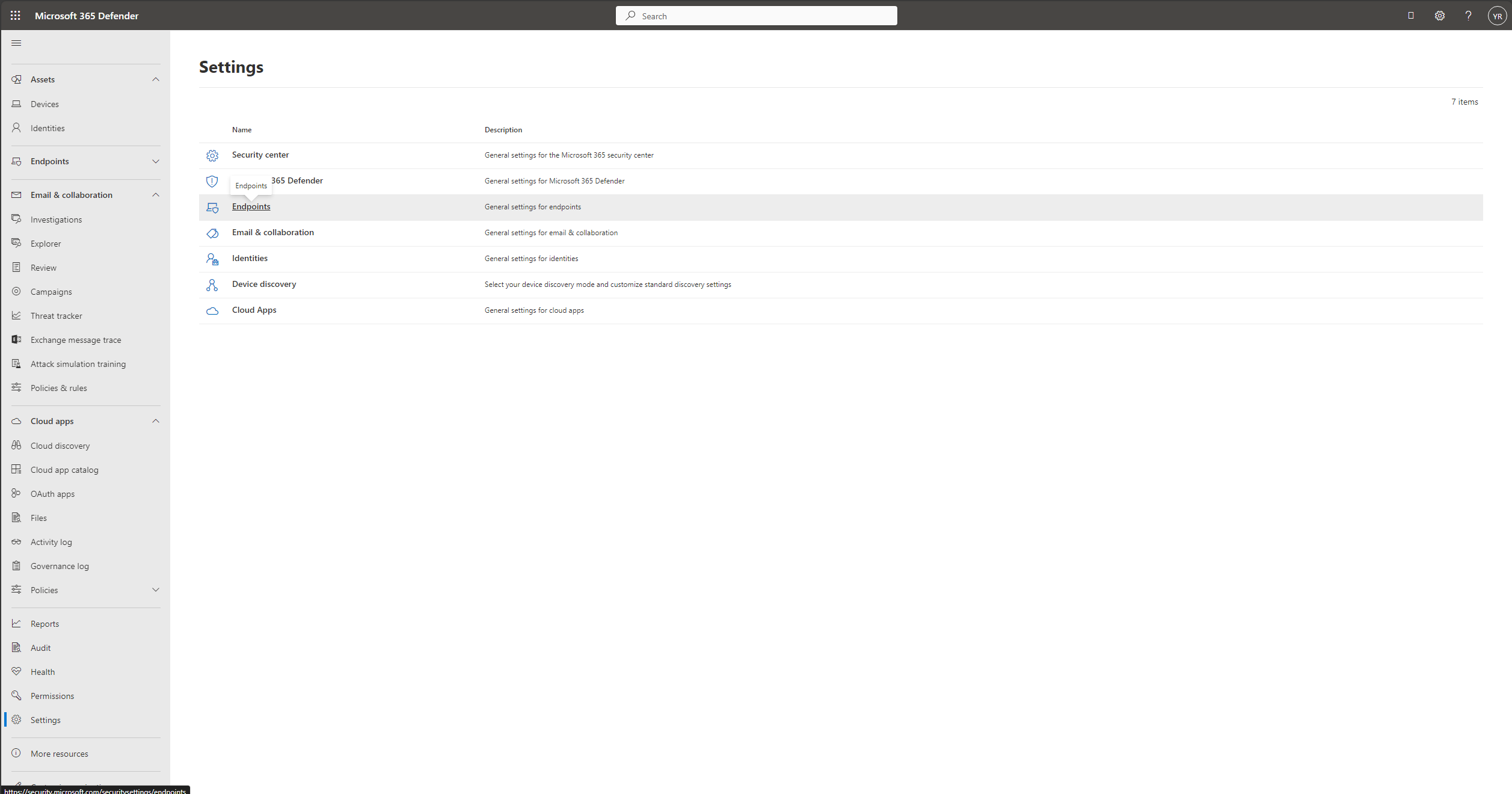 Nel portale Microsoft Defender (security.microsoft.com) selezionare Impostazioni e quindi Endpoint.