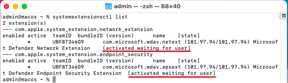 Si noti che entrambe le Microsoft Defender per endpoint nelle estensioni macOS si trova nello stato [attivato in attesa dell'utente].