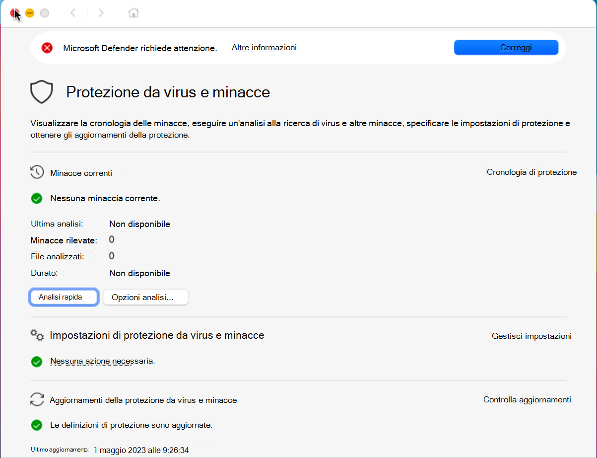 La sezione Sezioni che forniscono indicazioni sull'abilitazione dei profili necessari per Microsoft Defender per endpoint fornisce indicazioni su come risolvere questo problema, a seconda del metodo usato per distribuire Microsoft Defender per endpoint in macOS.