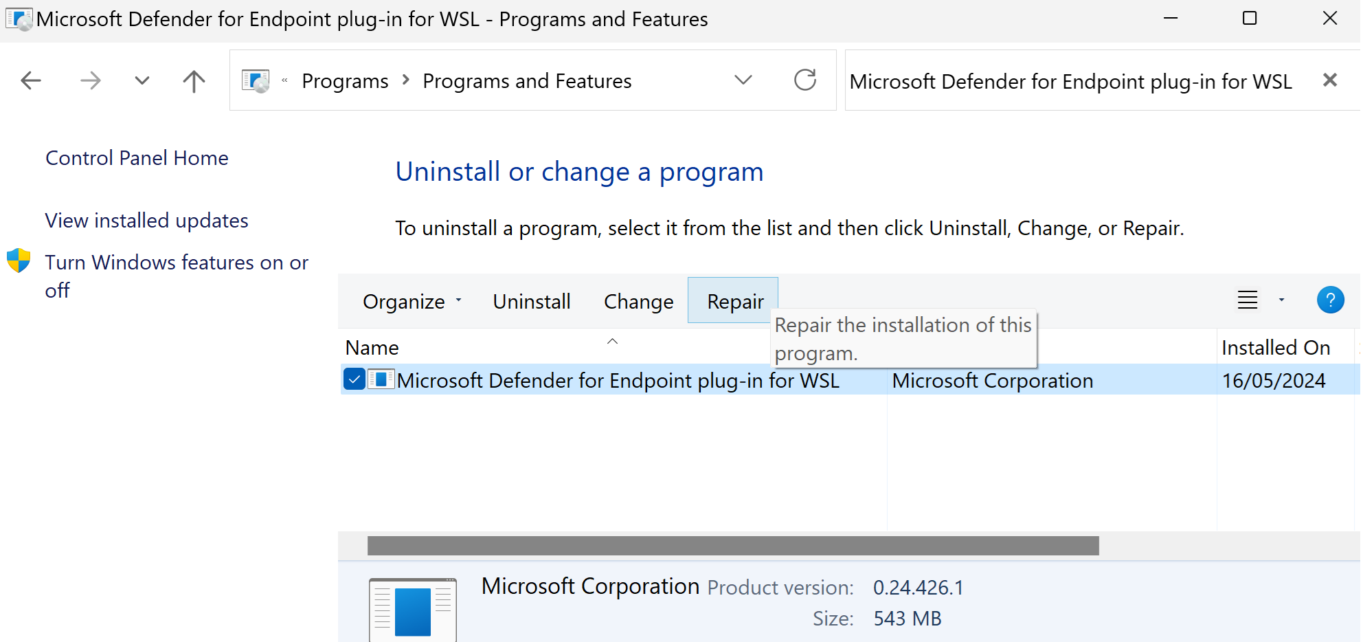 Se viene visualizzato un errore durante l'avvio di WSL, ad A fatal error was returned by plugin 'DefenderforEndpointPlug-in' Error code: Wsl/Service/CreateInstance/CreateVm/Plugin/ERROR_FILE_NOT_FOUNDesempio , significa che il plug-in Defender per endpoint per l'installazione di WSL è difettoso. Per ripristinarlo, seguire questa procedura: