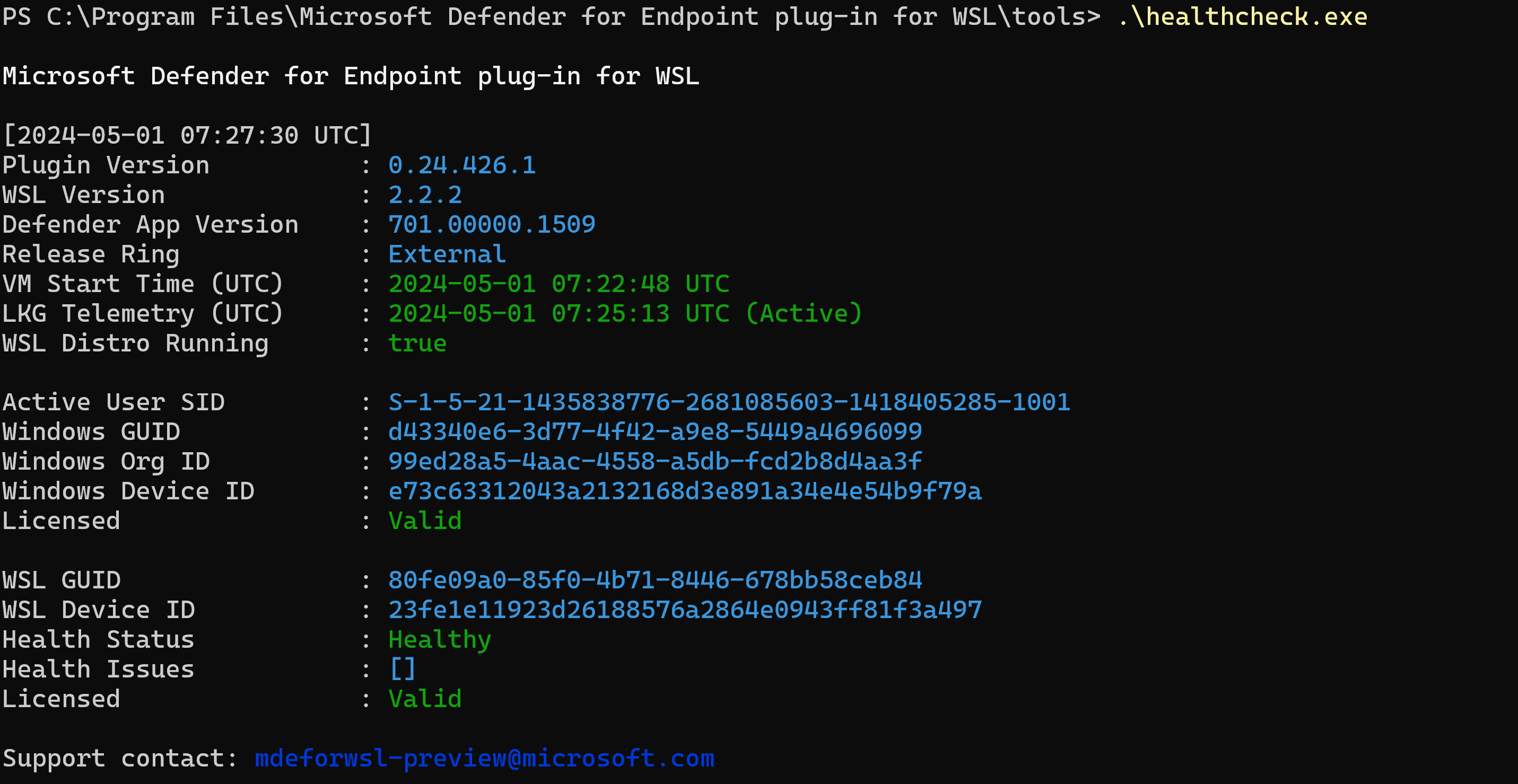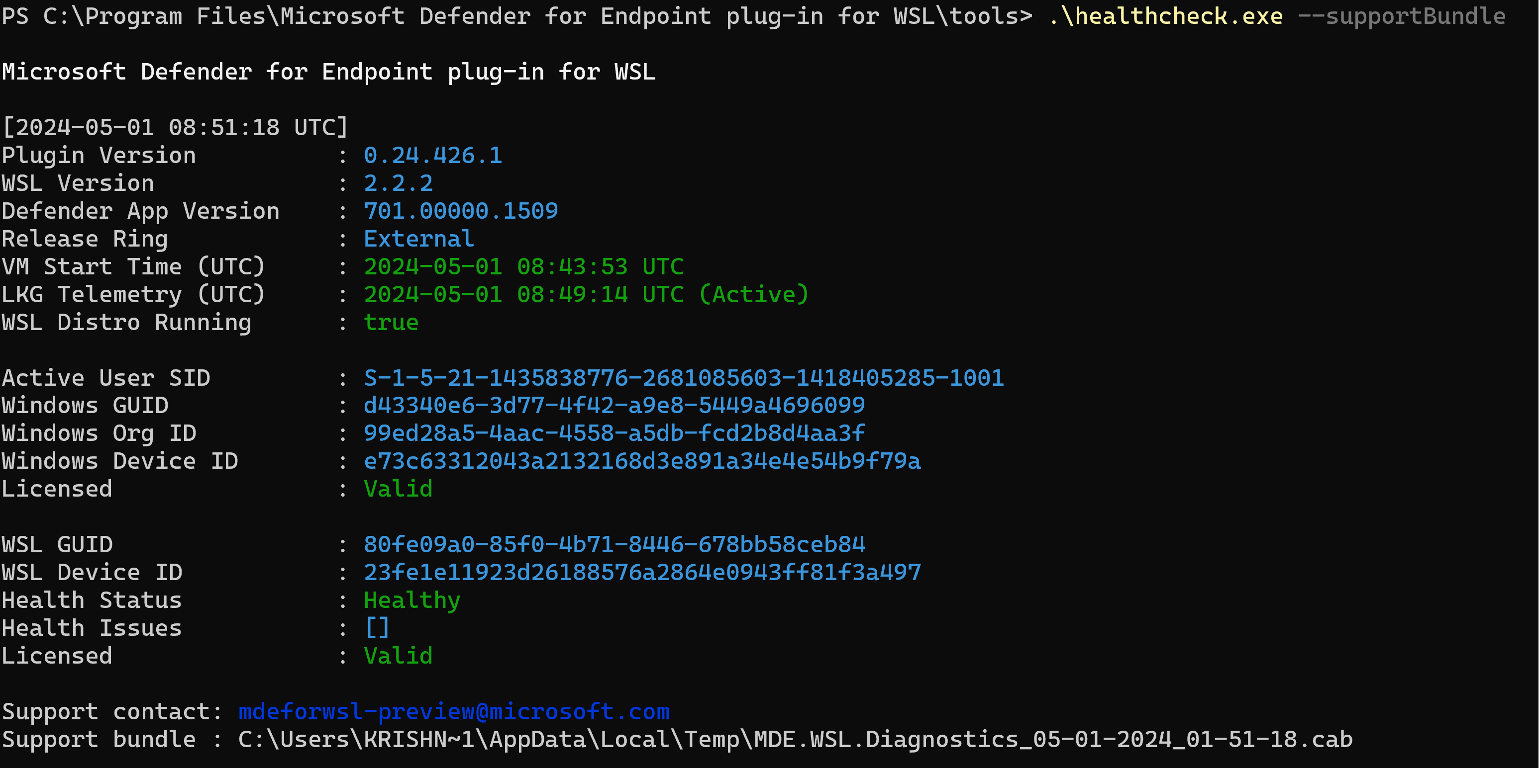 cd "%ProgramFiles%\Microsoft Defender for Endpoint plug-in for WSL\tools".\healthcheck.exe --supportBundleIl bundle di supporto è disponibile nel percorso fornito dal comando precedente.