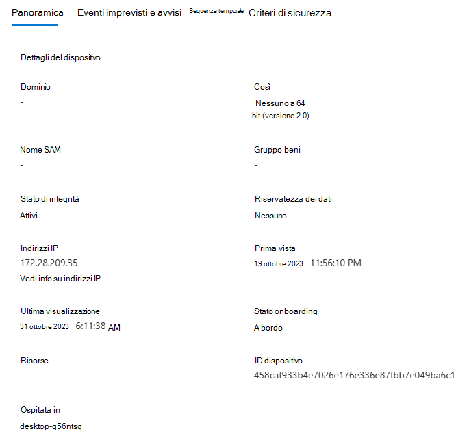 Aprire la pagina del dispositivo. Nel riquadro Panoramica è disponibile un collegamento per la posizione in cui è ospitato il dispositivo. Il collegamento consente di comprendere che il dispositivo è in esecuzione in un host Windows. È quindi possibile passare all'host per ulteriori indagini e/o risposte.
