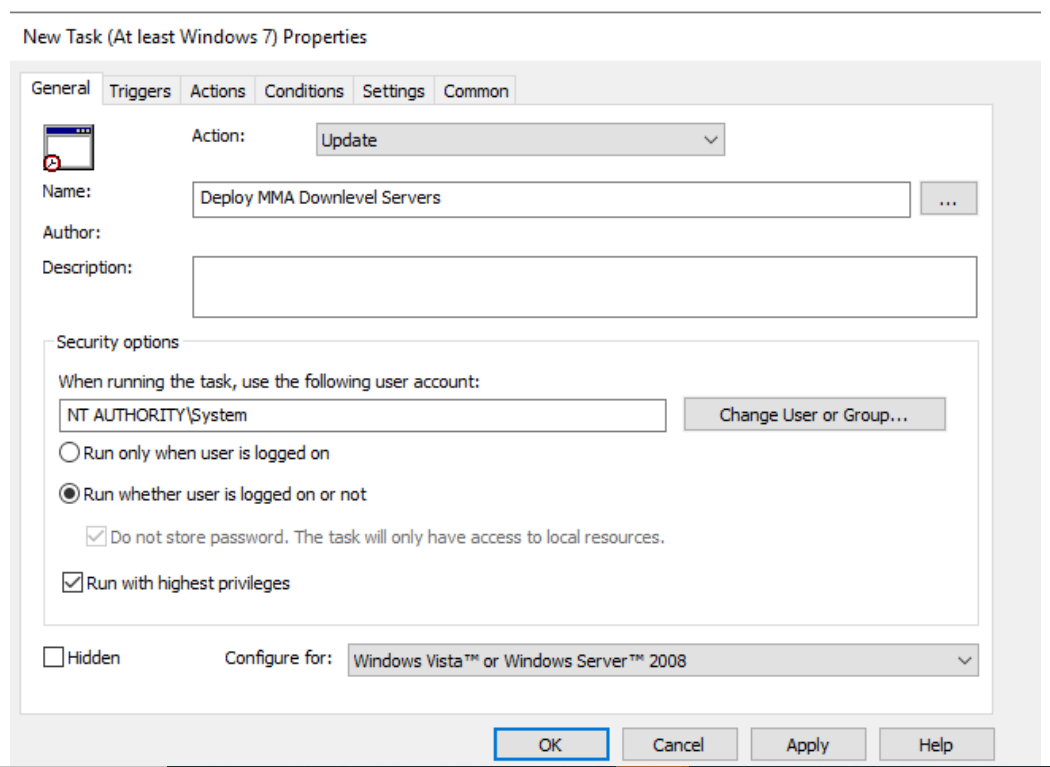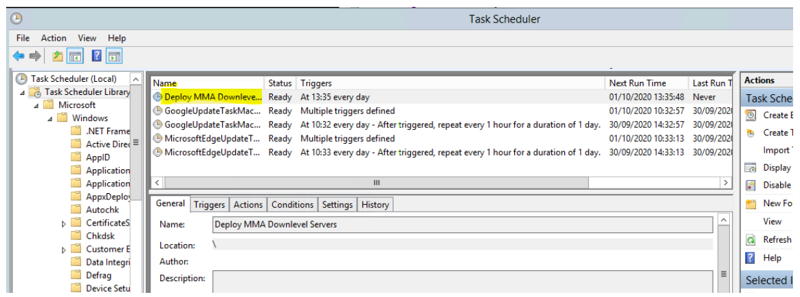 Poiché lo script dispone di un metodo di uscita e non viene rieseguito se l'MMA è installato, è anche possibile usare un'attività pianificata giornaliera per ottenere lo stesso risultato. Analogamente a un criterio di conformità Gestione configurazione, verificherà ogni giorno che l'MMA sia presente.