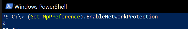 (Get-MpPreference).EnableNetworkProtection.Questa operazione dovrebbe rispondere con un valore 0, come illustrato nell'immagine seguente: