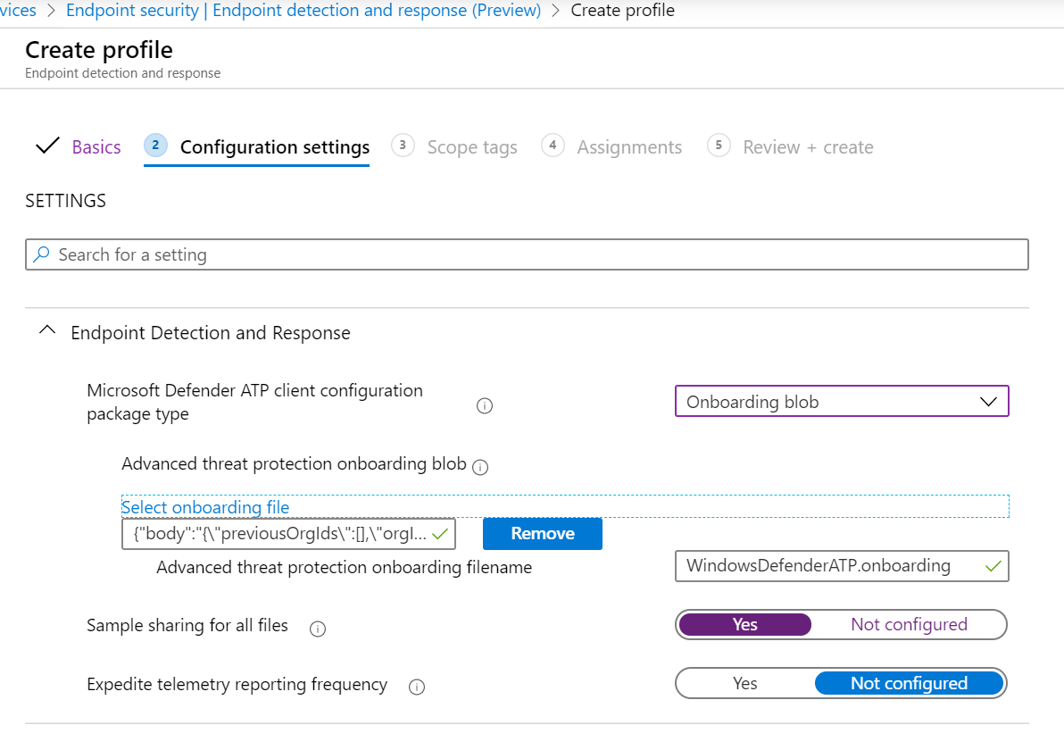 Passaggio 2: Creare criteri di configurazione per configurare le funzionalità di Microsoft Defender per endpoint