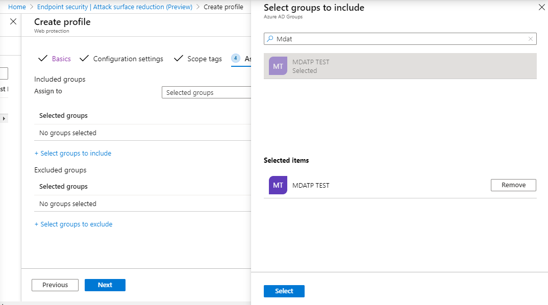 Selezionare gruppi da includere, assegnare al gruppo di test e quindi selezionare Avanti.