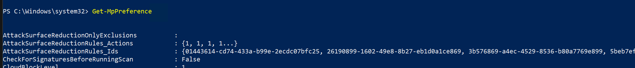 Get-MpPreference.Dovrebbero essere visualizzate le righe seguenti con contenuto, come illustrato nell'immagine seguente: