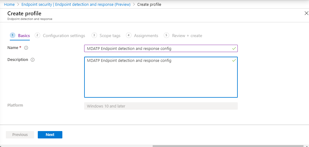 In Piattaforma selezionare Windows 10, Windows 11 e Windows Server Profilo - Rilevamento endpoint e risposta > Crea.