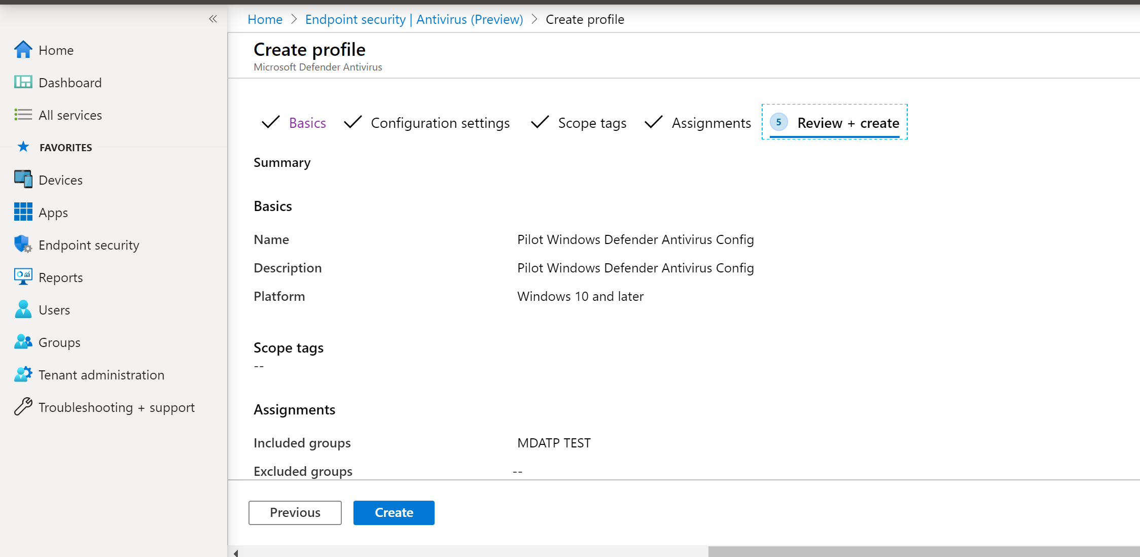 Selezionare Platform - Windows 10 and Later - Windows and Profile - Microsoft Defender Antivirus Create (Piattaforma - Windows 10 e versioni successive - Windows and Profile - Microsoft Defender Antivirus > Create).