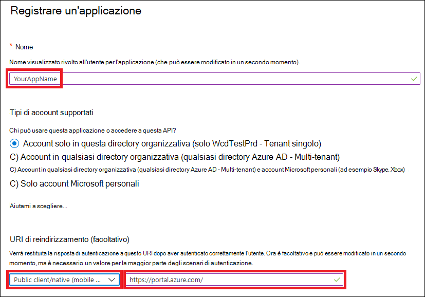 3. Nel modulo scegliere un nome per l'applicazione e immettere le informazioni seguenti per l'URI di reindirizzamento, quindi selezionare Registra.