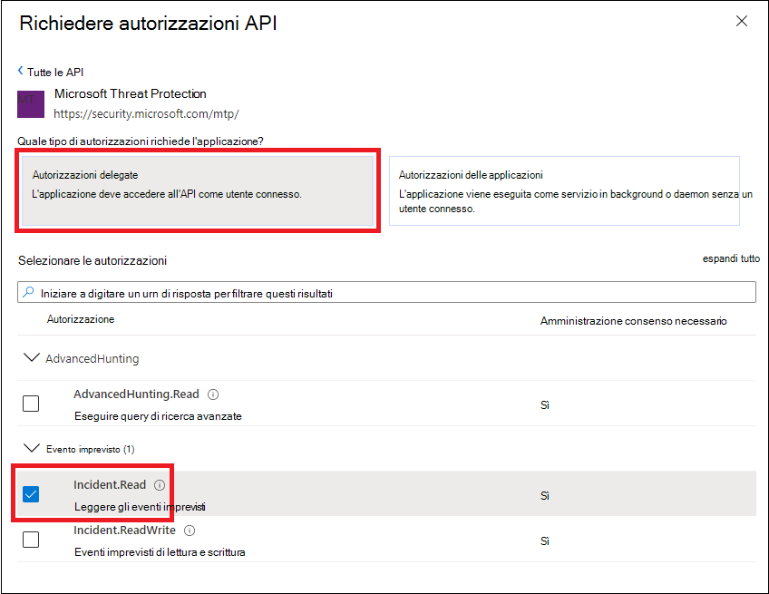 • Scegliere Autorizzazioni delegate. Scegliere le autorizzazioni pertinenti per lo scenario, ad esempio Incident.Read, e quindi selezionare Aggiungi autorizzazioni.
