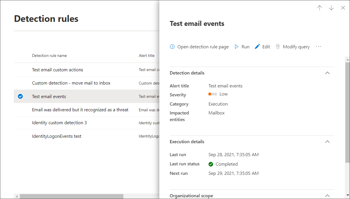 È possibile visualizzare l'elenco delle regole di rilevamento personalizzate esistenti, controllarne le esecuzioni precedenti ed esaminare gli avvisi attivati. È anche possibile eseguire una regola su richiesta e modificarla.