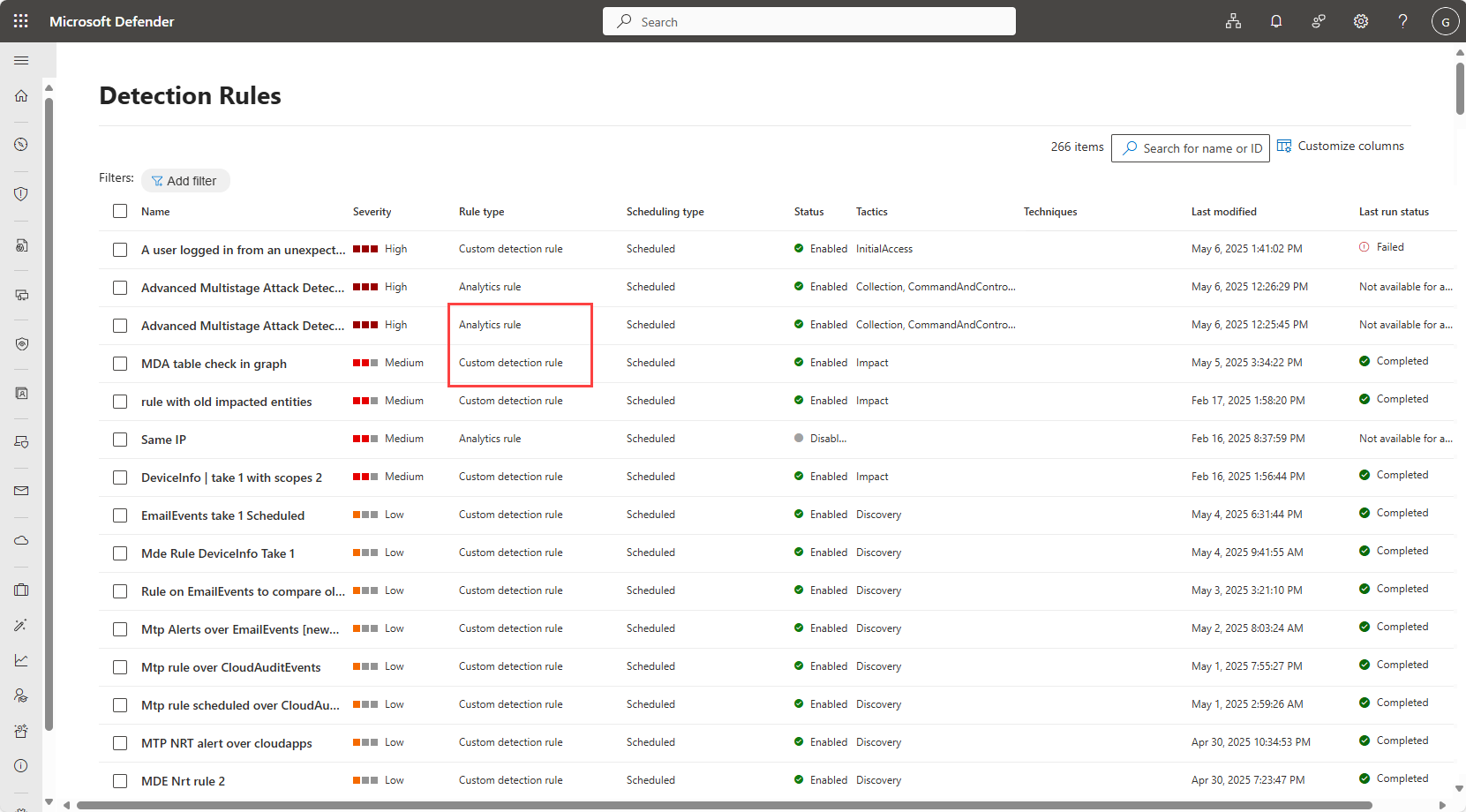 Per gli utenti che hanno caricato un'area di lavoro Microsoft Sentinel nel portale di Microsoft Defender unificato, l'elenco delle regole di rilevamento personalizzate include regole di analisi. Le sezioni seguenti si applicano anche alle regole di analisi, se non diversamente indicato.
