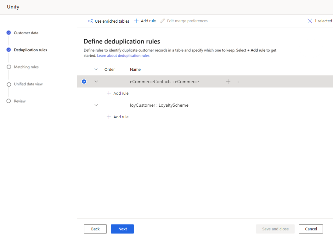 Nella pagina Regole di deduplicazione seleziona una tabella e quindi Aggiungi regola per definire le regole di deduplicazione.