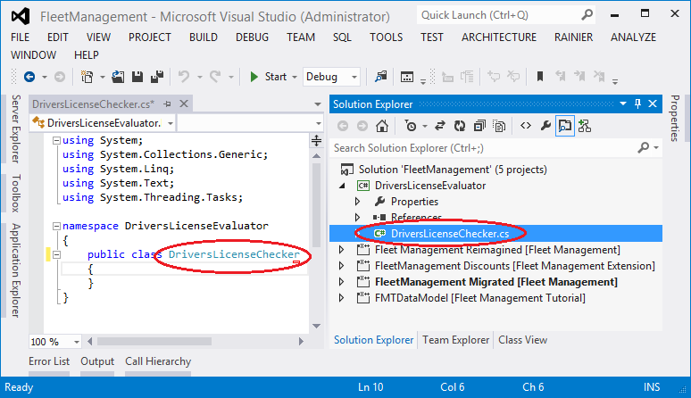 In Solution Explorer, under the DriversLicenseEvaluator project, right-click the file name Class1.cs and rename it DriversLicenseChecker.cs.