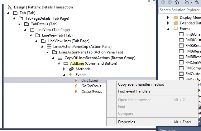 Different framework events are exposed on the designers of many types of element and sub-elements, like table events, form events, form data source events, and form control events.