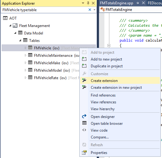 FMVehicle type:Tablein the filter bar and press Enter.Right-click FMVehicle, and then select Create extension.