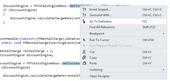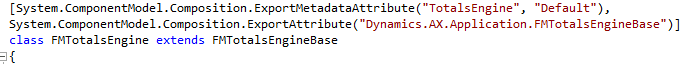 In the code editor window that displays FMRentalCharge_Extension.xpp, right-click GetInstance, and then select Go To Definition. The code editor opens with the abstract class FMTotalsEngineBase. This abstract class is called a plugin point and it's associated with the following attribute: [Microsoft.Dynamics.AX.Platform.Extensibility.ExportInterfaceAttribute()]