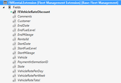 Expand the Fields node to see that this extension contains one added field, FEVehicleRateDiscount, to the base FMRental table.