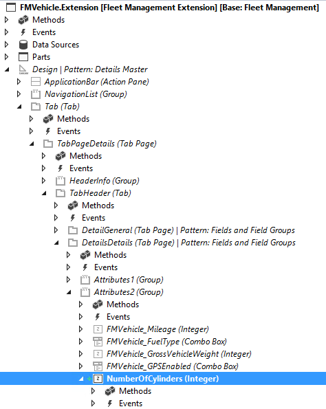 Add a new integer control named NumberOfCylinders to the Attributes2 group control as shown below. You can find this control by expanding Design > Tab > TabPageDetails > TabHeader > DetailsDetails > Attributes2.