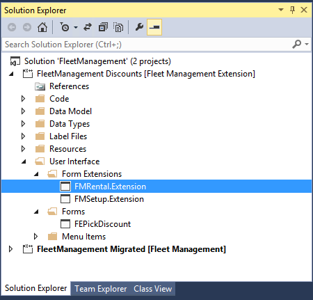 Next, add an extension to the FMVehicle form in the FleetManagement Discounts project. First, be sure to select this project in Solution Explorer.