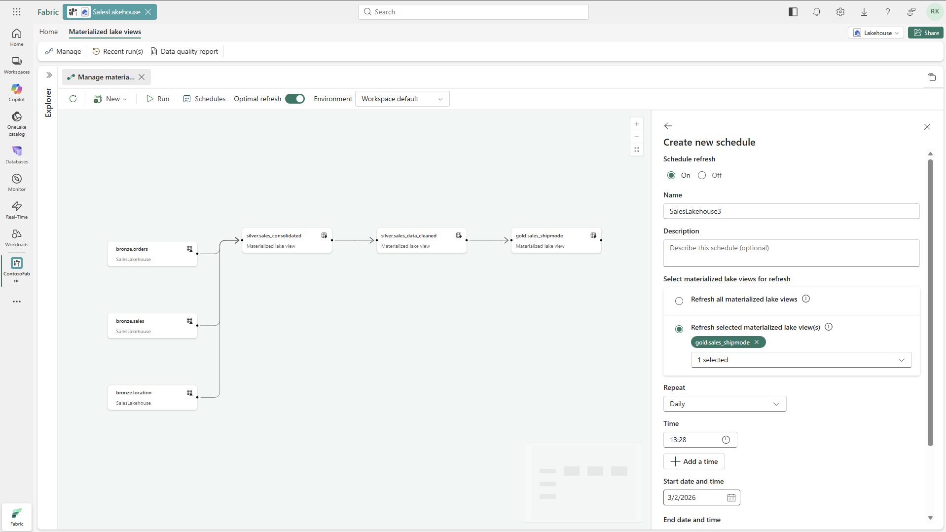 In questa sezione, crei i livelli bronzo, argento e oro per l'architettura medallion in SalesLakehouse. Questi livelli definiscono il flusso di dati basato sulla genealogia per le viste di lago materializzate.