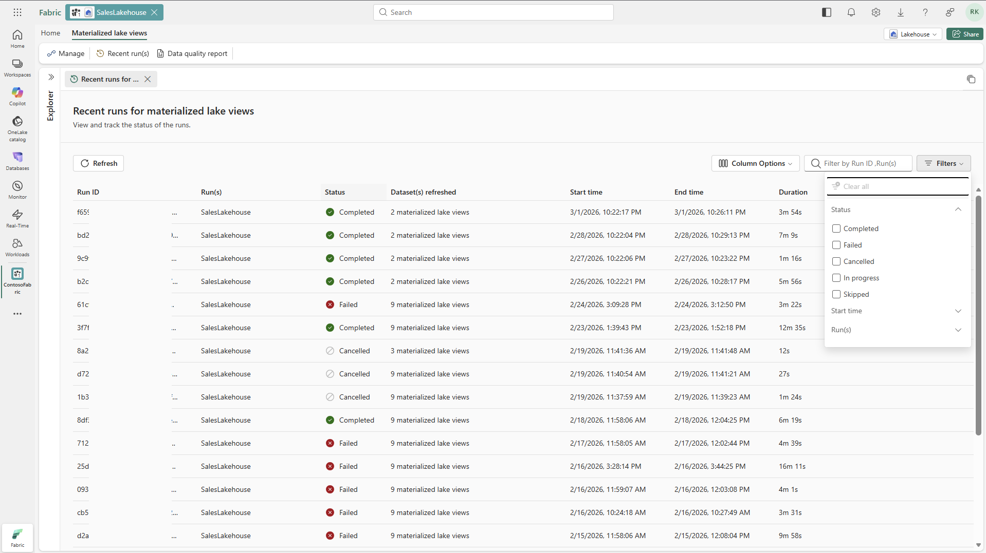 In SalesLakehouse, aprire la scheda Viste del lago materializzato e selezionare Gestisci per aprire il tracciamento.