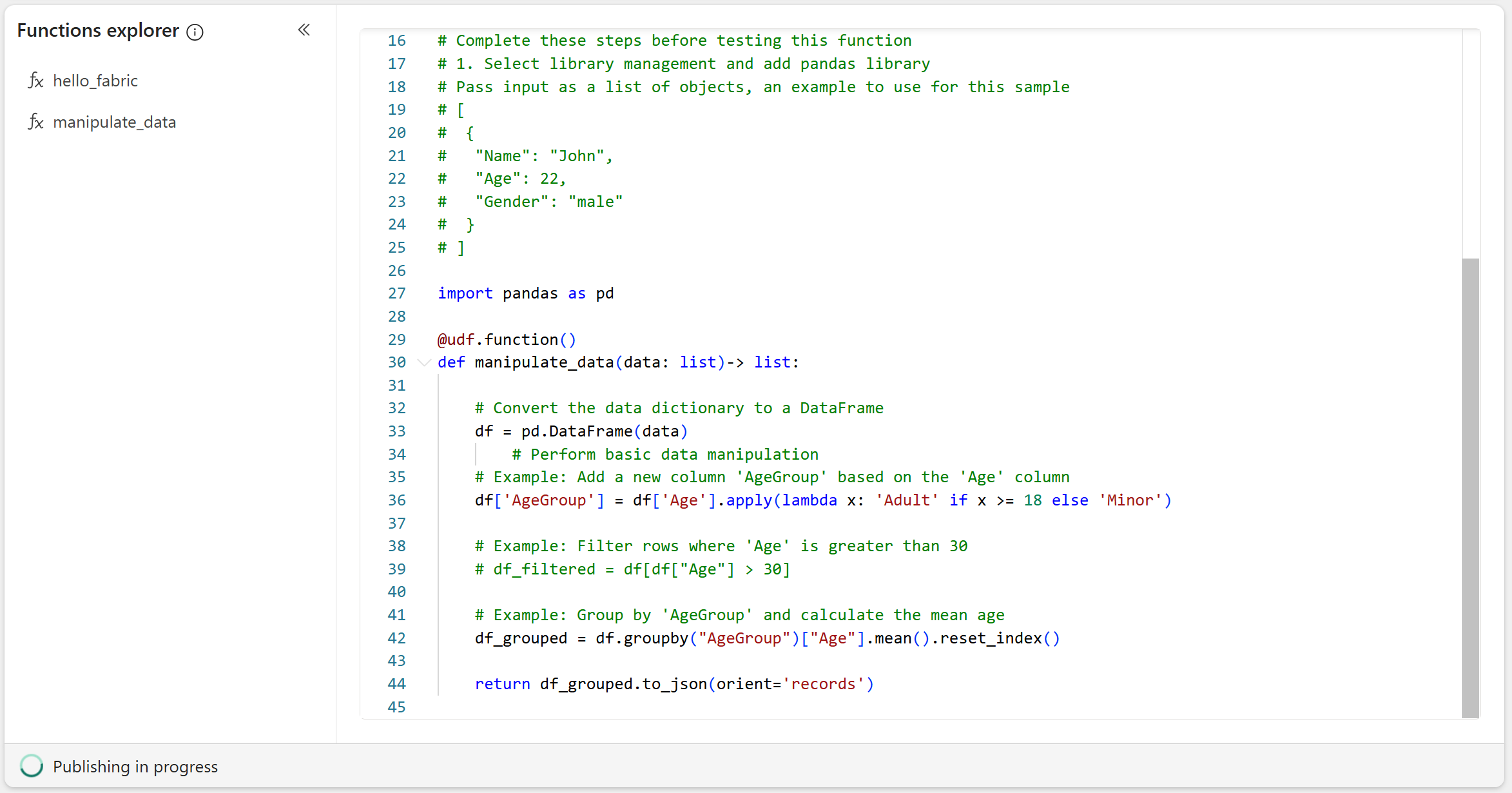 hello_fabric, è possibile eseguirla dall'elenco di funzioni in Esplora funzioni.