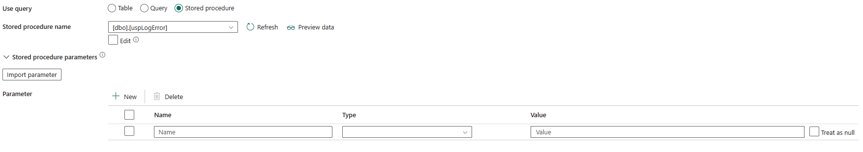 Parametri della stored procedure: specificare i valori per i parametri della stored procedure. I valori consentiti sono coppie nome-valore. I nomi e le maiuscole/minuscole dei parametri devono corrispondere ai nomi e alle maiuscole/minuscole dei parametri della stored procedure. È possibile selezionare Importa parametri per ottenere i parametri della stored procedure.