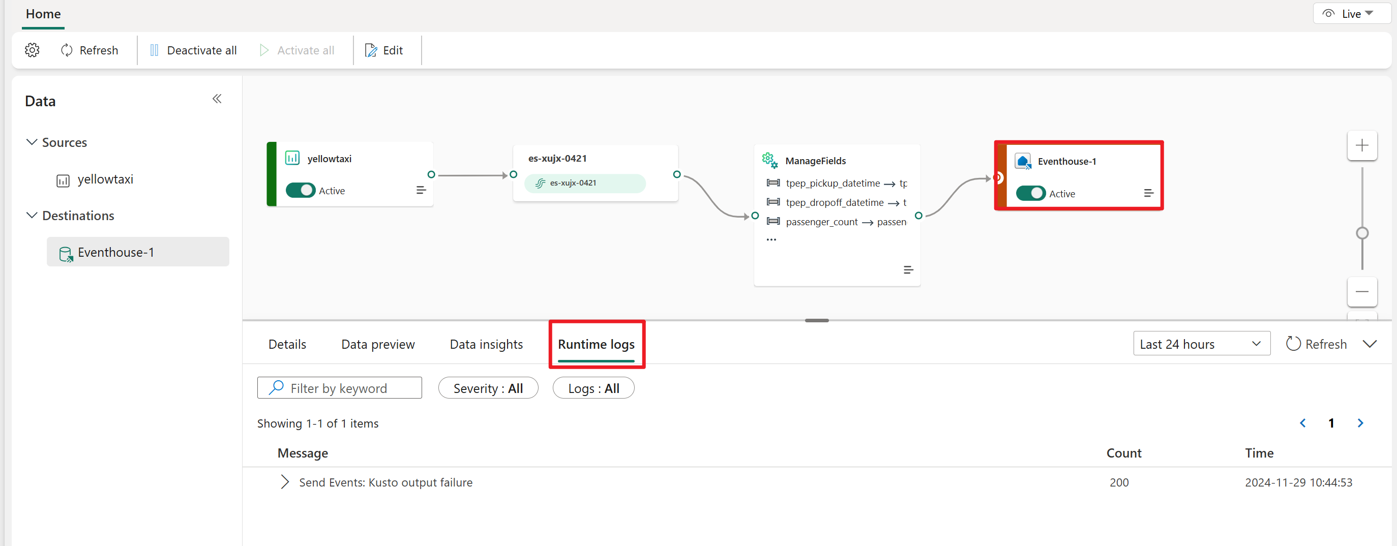 Usare la scheda Log di runtime per controllare i log dettagliati che si verificano nel motore eventstream. I log di runtime hanno tre livelli di gravità: avviso, errore e informazioni.