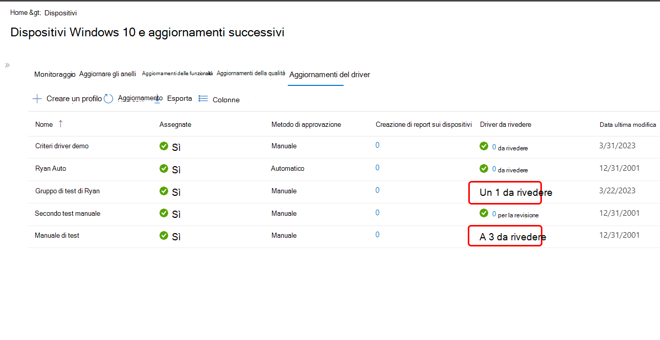 Quando si visualizza l'elenco dei criteri di aggiornamento dei driver windows, i criteri con nuovi aggiornamenti dei driver che richiedono l'approvazione manuale mostrano un'icona di avviso gialla e un conteggio degli aggiornamenti "da rivedere". Questo avviso viene visualizzato nella colonna Driver per esaminare l'elenco dei criteri. Per altre informazioni sulla gestione degli aggiornamenti dei driver, vedere Identificare i criteri con gli aggiornamenti dei driver appena aggiunti in questo articolo.