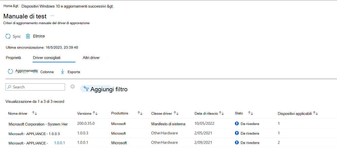 Per i criteri con approvazioni manuali, tutti i nuovi aggiornamenti dei driver vengono aggiunti ai criteri con lo stato Revisione delle esigenze. Questo stato si applica agli aggiornamenti aggiunti sia ai driver consigliati che ad altri elenchi di driver . Un amministratore deve approvare tutti gli aggiornamenti in un criterio di approvazione manuale prima di poter eseguire la distribuzione nei dispositivi.