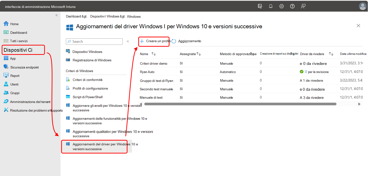 Accedere all'interfaccia di amministrazione Microsoft Intune e passare alla scheda Dispositivi> perpiattaforma>Windows>Gestisci aggiornamenti>Windows 10 e aggiornamenti> successiviAggiornamenti driver e selezionare Crea profilo.
