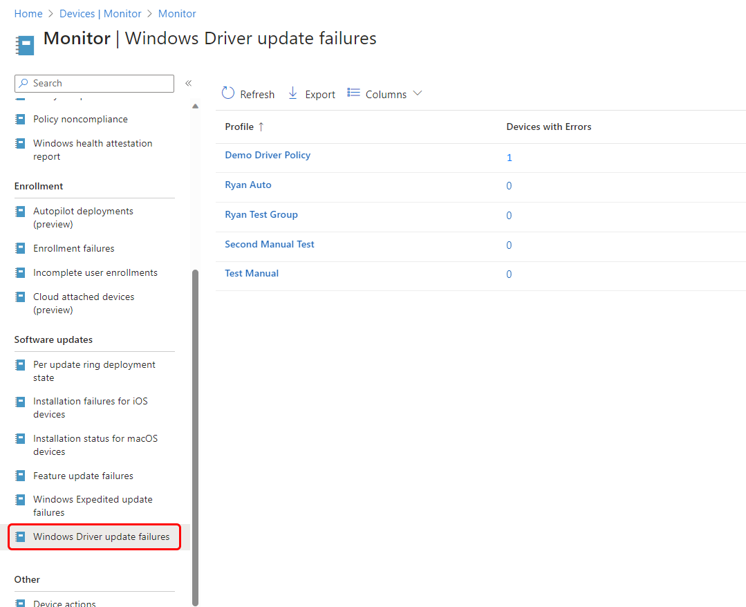 Gli aggiornamenti dei driver Windows includono un report sugli errori di aggiornamento del driver. Per trovare questo report, nell'interfaccia di amministrazione passare a Dispositivi>Monitora> glierrori di aggiornamento del driver Windows. Questo report fa parte del gruppo Aggiornamenti software e potrebbe richiedere di scorrere verso il basso l'interfaccia di amministrazione per individuarlo.