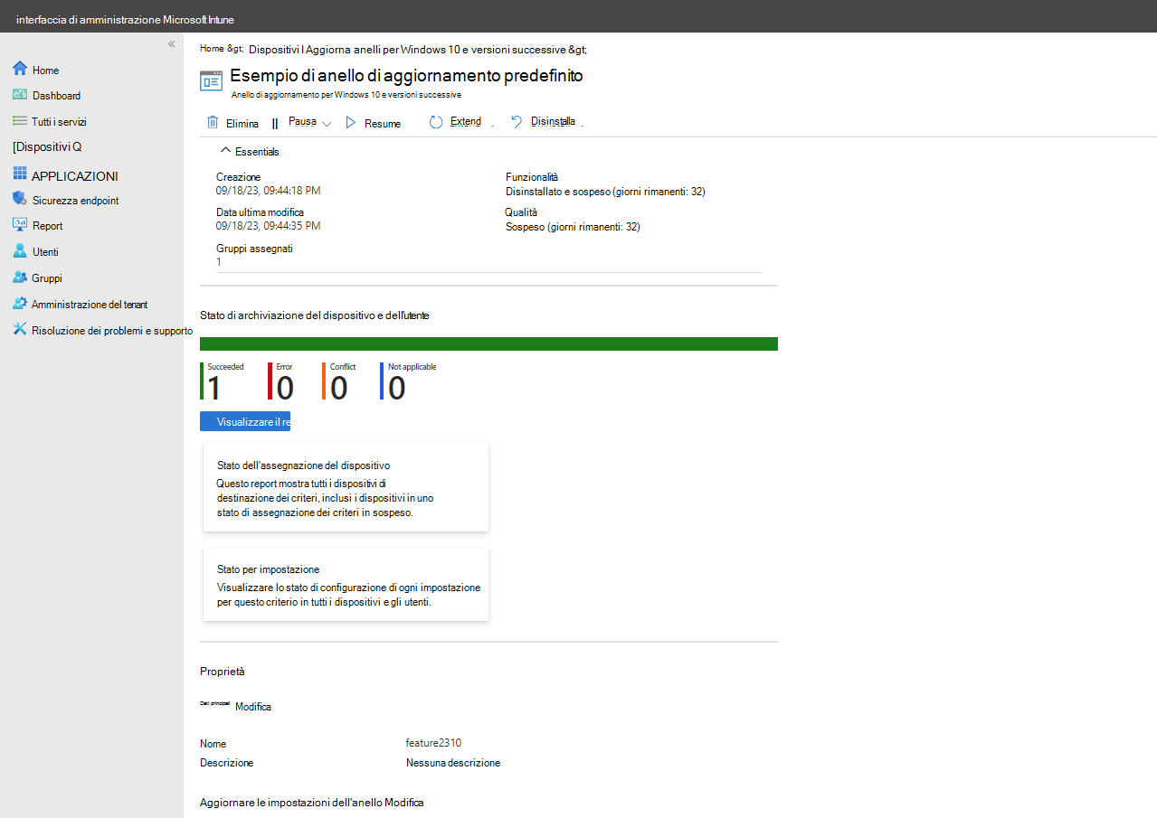 Per informazioni dettagliate sulle azioni dei criteri nella parte superiore della visualizzazione dei criteri, ad esempio Elimina, Sospendi ed Estendi, vedere Gestire gli anelli di Windows Update negli anelli di aggiornamento per Windows 10 e criteri successivi in Intune articolo.