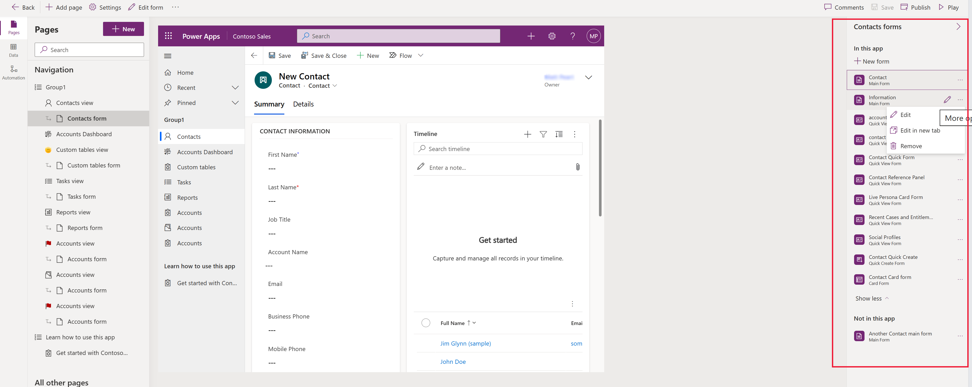 Nel riquadro di spostamento sinistro della finestra di progettazione dell'app selezionare Pagine e quindi selezionare un modulo di tabella, ad esempio il modulo Contatto.