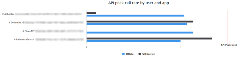 Per aiutare a interpretare e agire sulla capacità, il grafico mostra il limite di picco API. Le barre mostrano il numero massimo di richieste API da parte di app/utenti in un intervallo di 5 minuti. Il numero massimo di richieste per utente ogni cinque minuti si basa sulle licenze e sui componenti aggiuntivi di capacità.