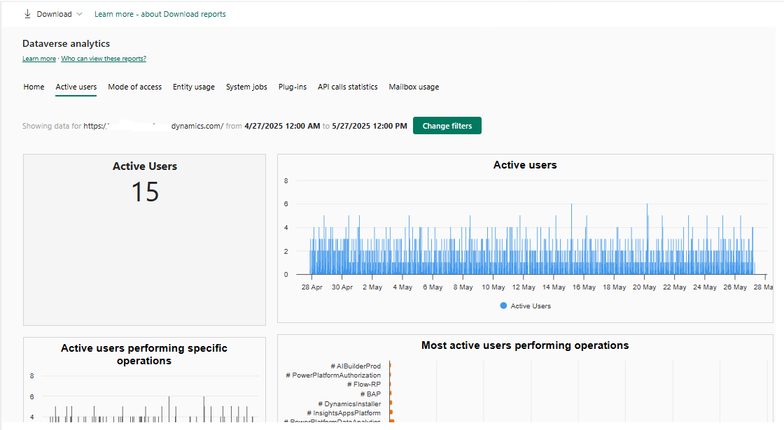 Tutti i report scaricabili, ad eccezione di Utenti attivi del piano Dynamics 365 Customer Engagement per applicazione, mostrano i dati per un singolo ambiente e in base ai filtri temporali per i report analitici Dataverse predefiniti. Se selezioni un determinato intervallo di date per i report di Dataverse predefiniti, lo stesso filtro si applica ai download. La durata massima per la disponibilità dei dati è di 30 giorni.